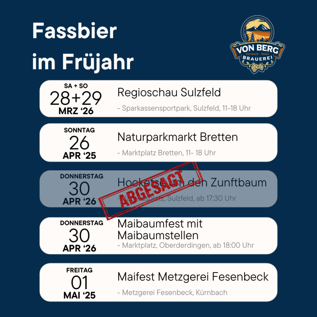 Diesen Sonntag, 26.10. sind wir auf dem Naturparkmarkt in Kürnbach – rund um den Marktplatz.⏰ 11:00–18:00 Uhr🍺 Frisches Helles & Kerwebier vom Fass – plus Flaschen zum Mitnehmen🚒 Verkauf am Stand der Feuerwehr Kürnbach Kommt vorbei, trinkt ein frisches Bier und deckt euch für zuhause ein. Wir freuen uns auf euch! 🙌 #Naturparkmarkt #Kürnbach #VonBergBrauerei […]